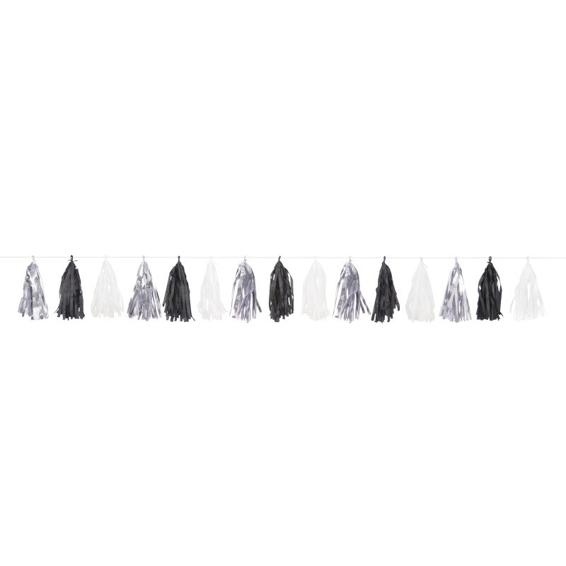 Silver, black, and white tassel garland 9ft.